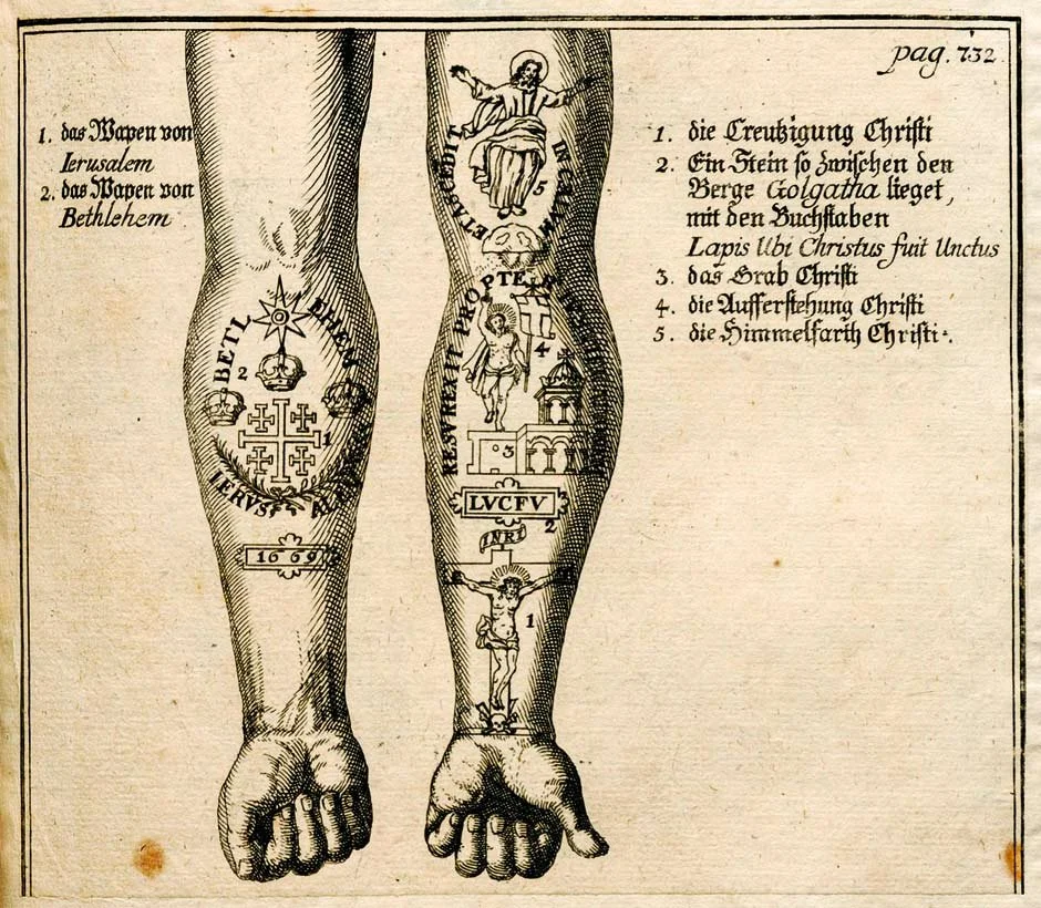 It is often assumed that tattooing disappeared in the Middle Ages due to religious decrees. However, tattoos feature in many representations of Christians. In Europe, tattoos were prevalent in the shape of pilgrims’ tattoos. Accounts and pictorial documents from the 16th to the 19th century, such as those by the Jerusalem pilgrim Ratge Stubbe, seem to have promoted secular tattooing back home. Stubbe was a 17th Century German Pilgrim from Hamburg/Itzehoe who received extensive, documented tattoos in Jerusalem in 1669. A 1676 engraving of his forearms show religious scenes — including the crucifixion, resurrection, and the Jerusalem cross — serving as an early example of “permanent ephemera” or “honorary stigmatization” worn by pilgrims. His tattoos are highlighted in Robert Ousterhout’s research as a prime example of Jerusalem pilgrimage traditions, predating Captain Cook’s voyages to Tahiti — often incorrectly cited as the start of modern western tattooing — by exactly 100 years
