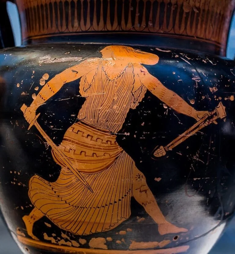 Attic red-figure vase (likely for mixing wine) depicting two Thracian women with tattoos on their arms and legs, the first of which is pictured with unsheathed sword perhaps in pursuit of Orpheus, who is not depicted