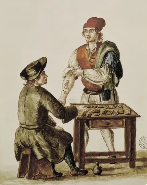 Eighteenth century painting documenting clothing and daily life of Venetians. Among the various occupations is this illustration of a tattoo artist called Giovanni Tebaldino, with a customer showing a tattoo. Wooden stamps are shown on the table.