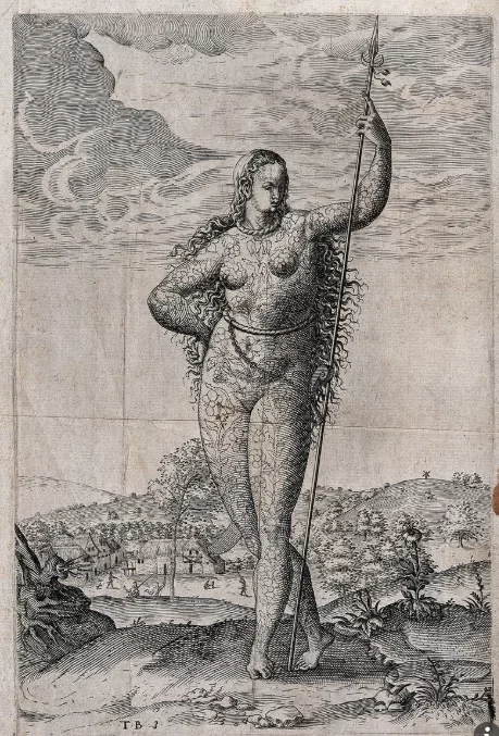 Pict woman by Theodor de Bry. From 7000 BC to around 845 AD, the Picts lived in the area of Europe now known as Scotland. They were covered from head to toe in elaborate tattoos, causing the Romans to refer to them as the “Pictii,” which is Latin for the “Painted Ones.” Animals were the main cause of inspiration for the tattoos of the Picts. They decorated their bodies with images of birds, fish, and various beasts of the region by pricking their skin with sharp bits of bone dipped in colored grasses, creating a blue hue for their permanent body paintings.